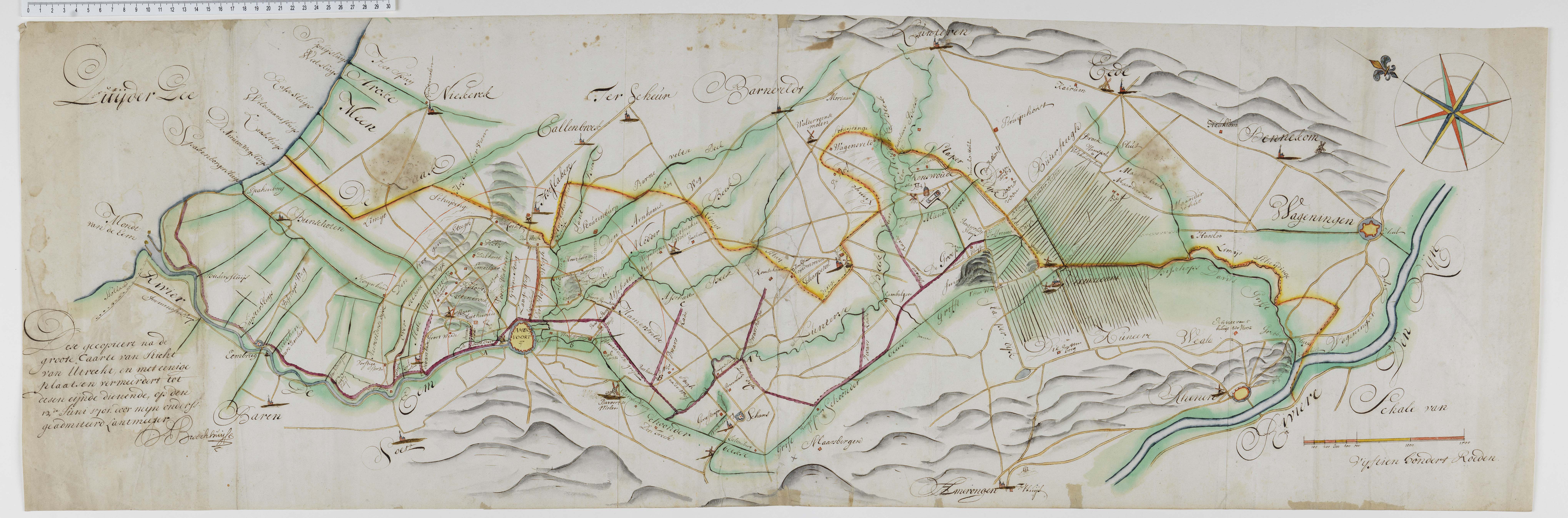 Kaart van het gebied van de Gelderse Vallei tussen de Zuiderzee en de Rijn, met schetsmatige weergave van dorpen, kastelen, molens, wegen en watergangen. J. van Broeckhuijsen - 1701 Publiek Domein 1.0